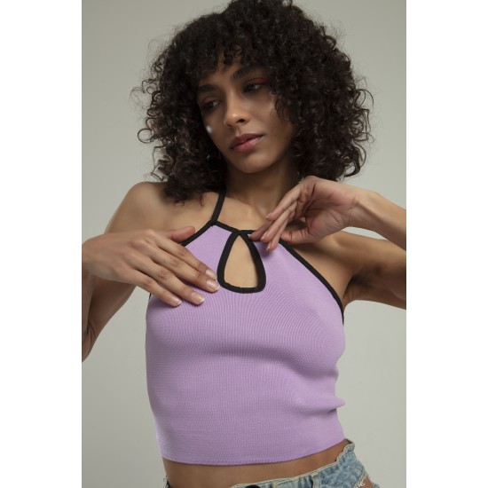Lila Renkli Kadın Boyundan Askılı Spor Triko Crop Top Badi