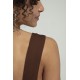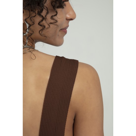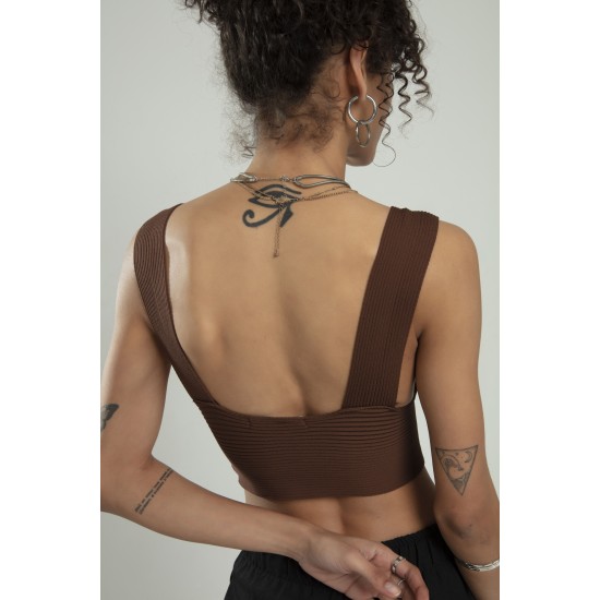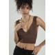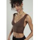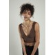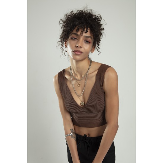 Kahve renkli kadın özel sprey boyamalı V yakalı spor triko atlet büstiyer crop top bluz.