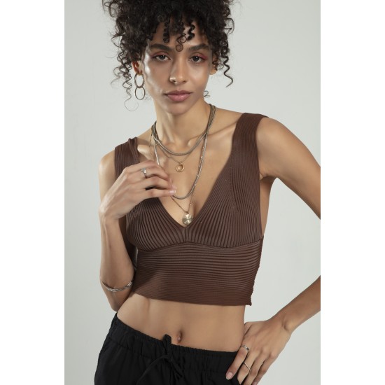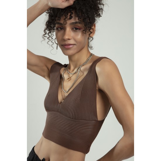 Kahve Renkli Kadın Özel Sprey Boyamalı V Yakalı Spor Triko Atlet Büstiyer Crop Top Bluz