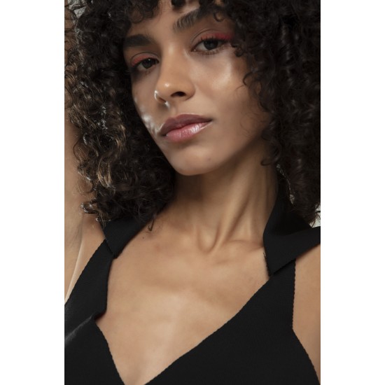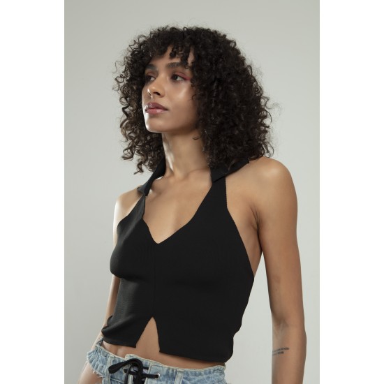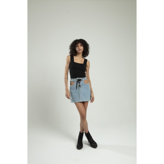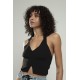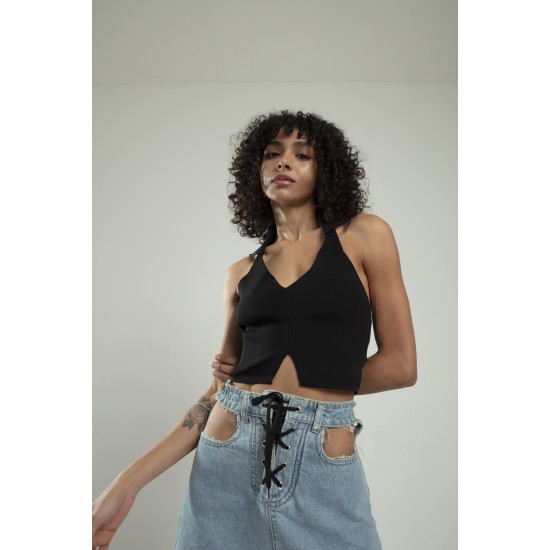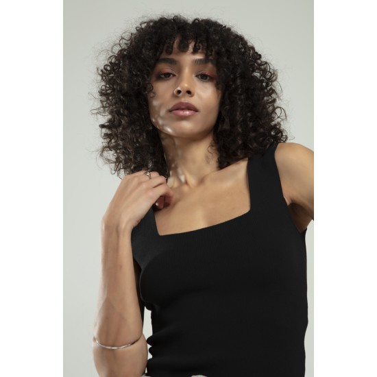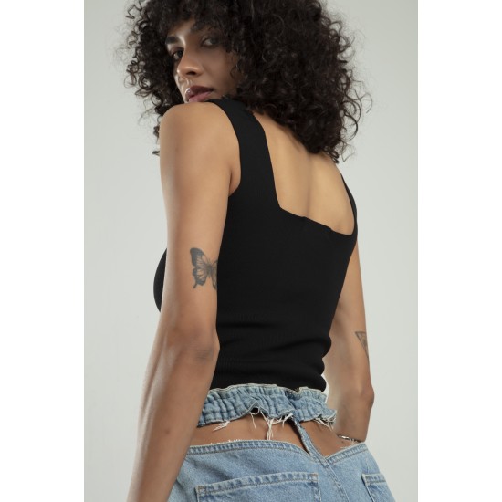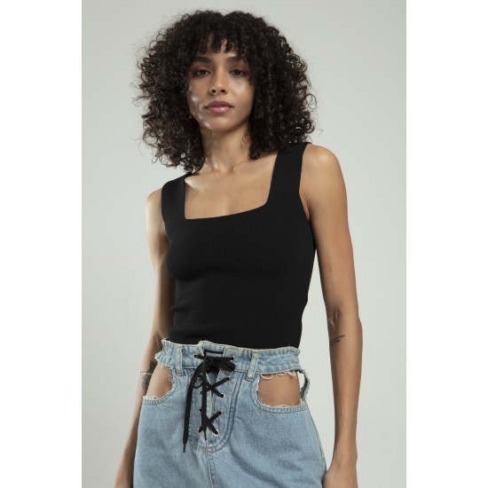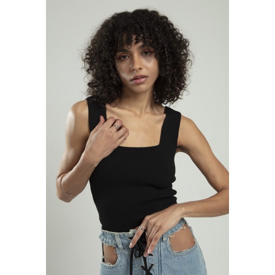 Siyah Renkli Kare Yaka Kadın Spor Askılı Triko Atlet Crop Top Bluz