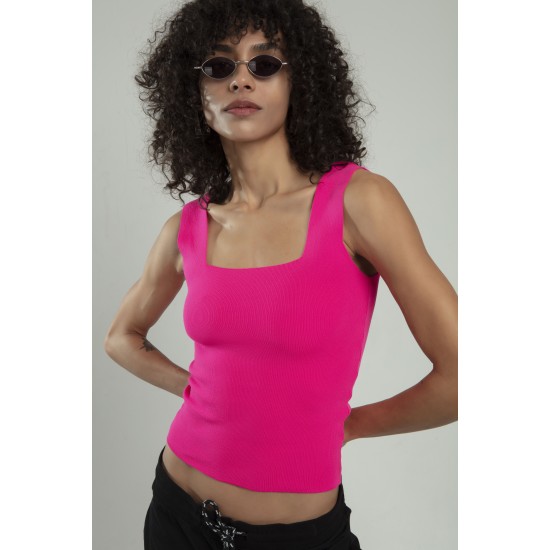 Fuşya Pembe Renkli Kare Yaka Kadın Spor Askılı Triko Atlet Crop Top Bluz