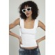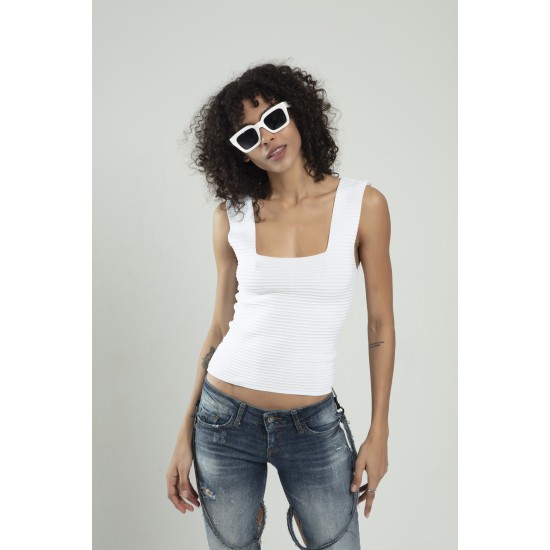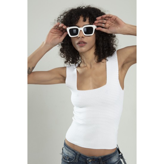 Beyaz Renkli Kare Yaka Kadın Yığma Desen Spor Askılı Triko Atlet Crop Top Bluz