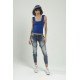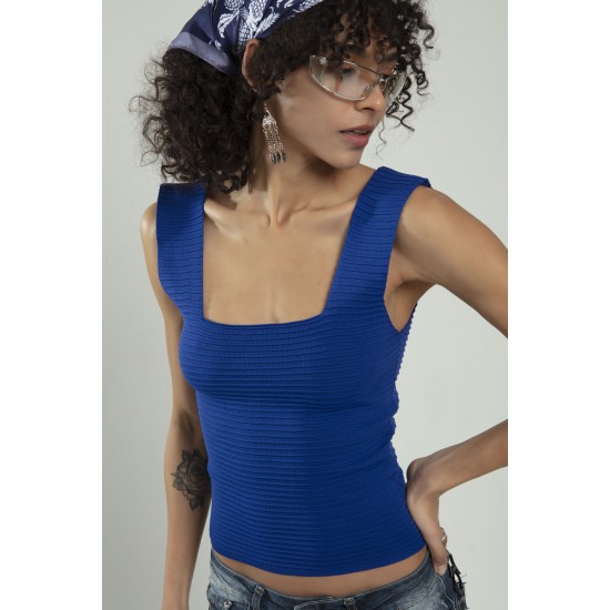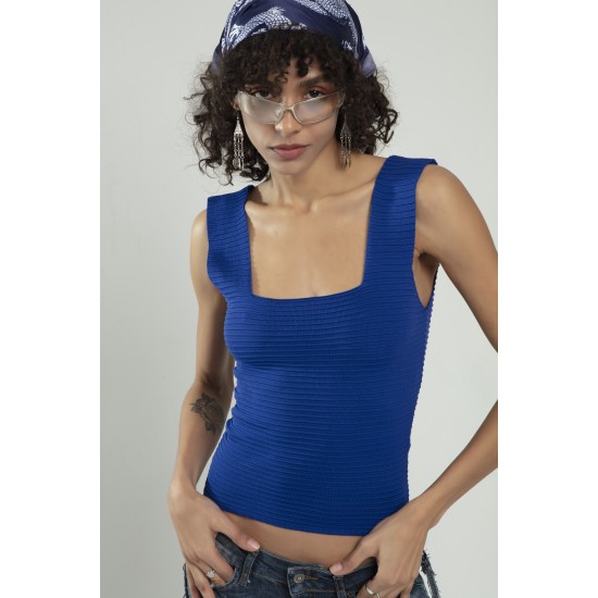 Sax Mavisi Renkli Kare Yaka Kadın Yığma Desen Spor Askılı Triko Atlet Crop Top Bluz
