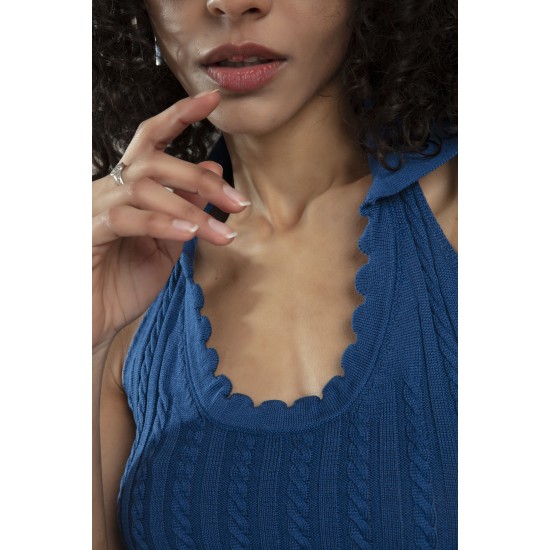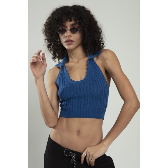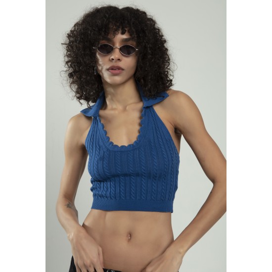 Polo Yaka İndigo Renkli Kadın Saç Örgülü Yuvarlak Açmalı Spor Triko Bluz Atlet Crop Top
