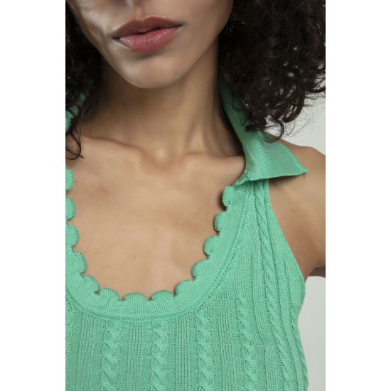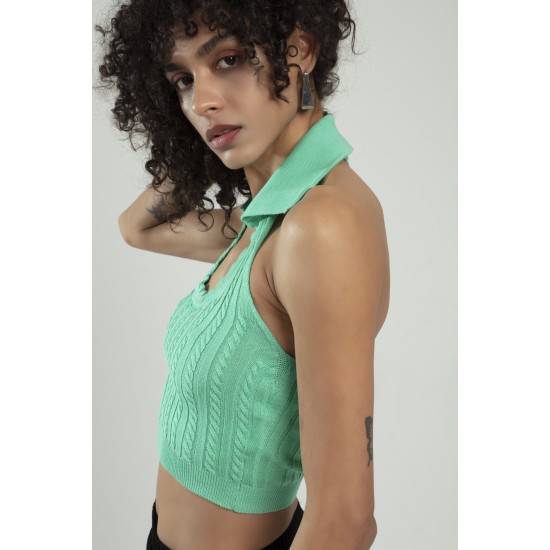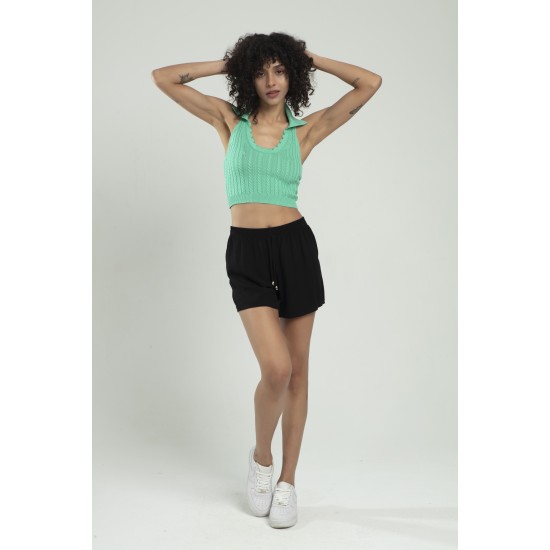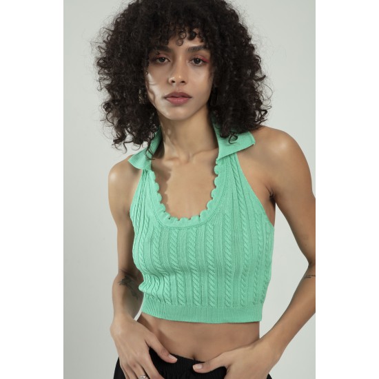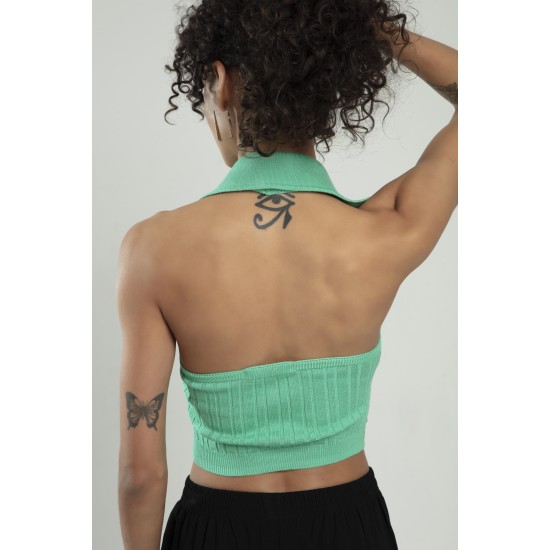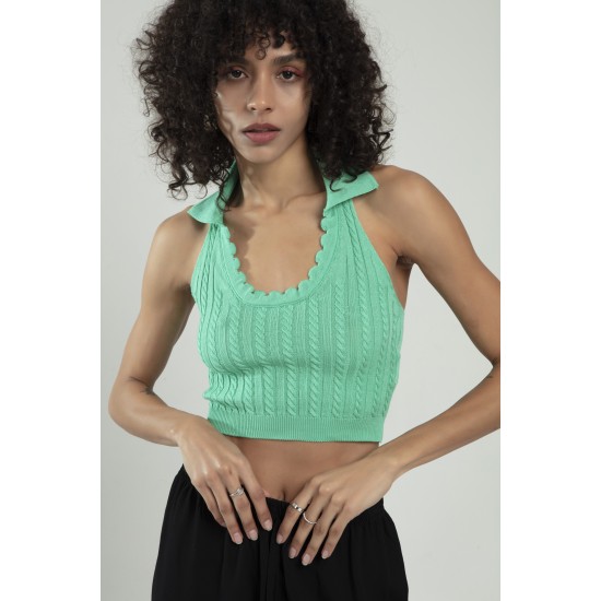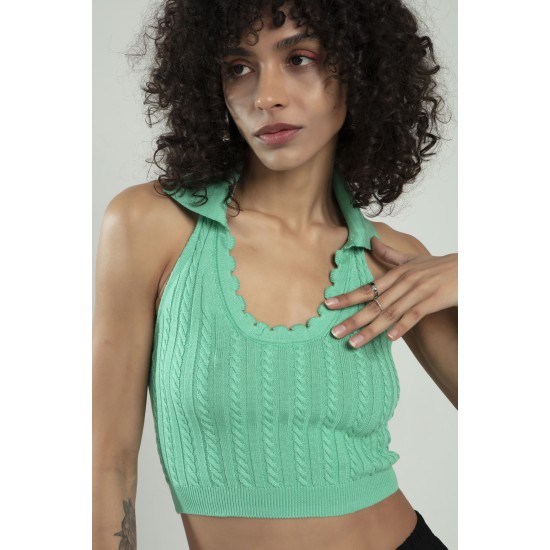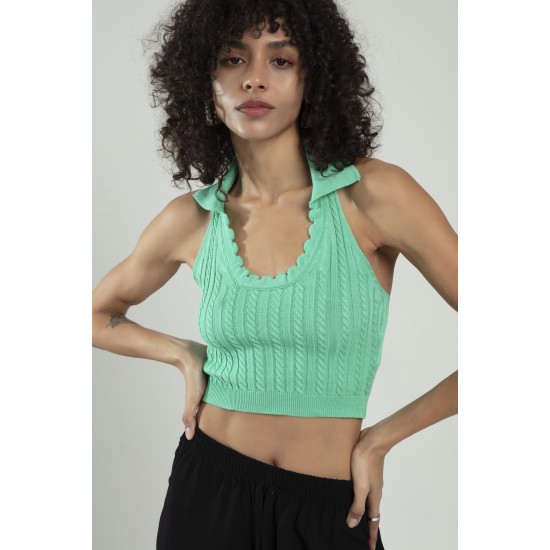 Polo YakaFıstık Yeşili Renkli Kadın Saç Örgülü Yuvarlak Açmalı Spor Triko Bluz Atlet Crop Top