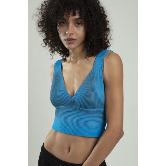Mavi renkli kadın özel sprey boyamalı V yakalı spor triko atlet büstiyer crop top bluz.