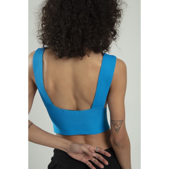 Mavi Renkli Kadın Özel Sprey Boyamalı V Yakalı Spor Triko Atlet Büstiyer Crop Top Bluz