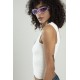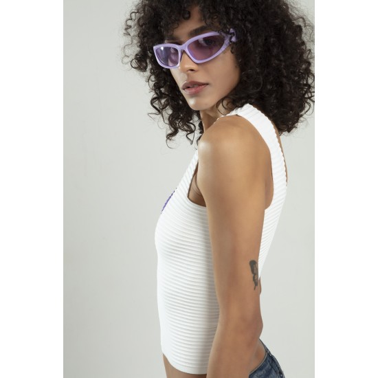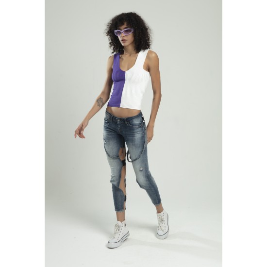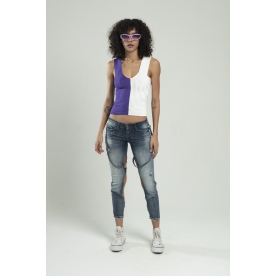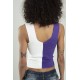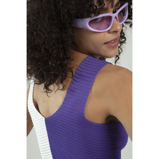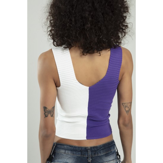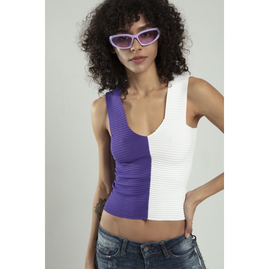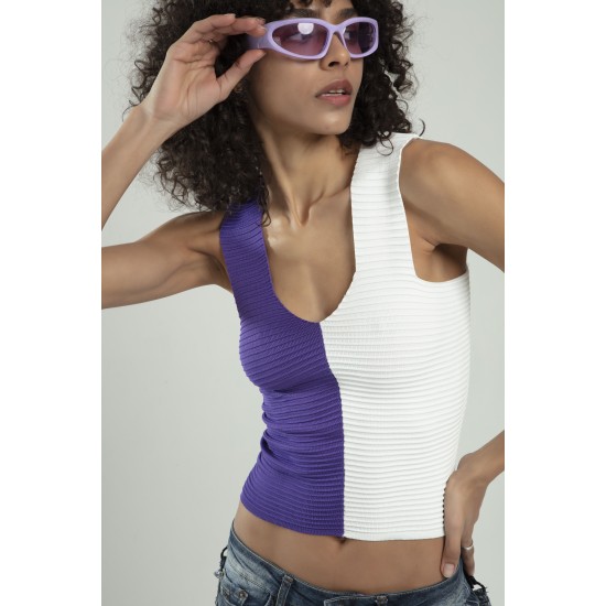 Lila - Beyaz iki renkli kadın spor askılı V yaka yığma desen triko atlet crop top bluz.